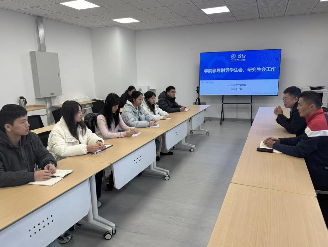 为加强学院学生组织建设,推动学生工作高质量发展,12月23日下午,材料学院召开领导干部联系指导学生组织座谈会。学院党委书记陈伟刚,学院党委副书记、副院长辛绍权,学院团委书记蒋旦悦,辅导员温泽,学生会和研究生会主席团及部门负责人参加本次会议。