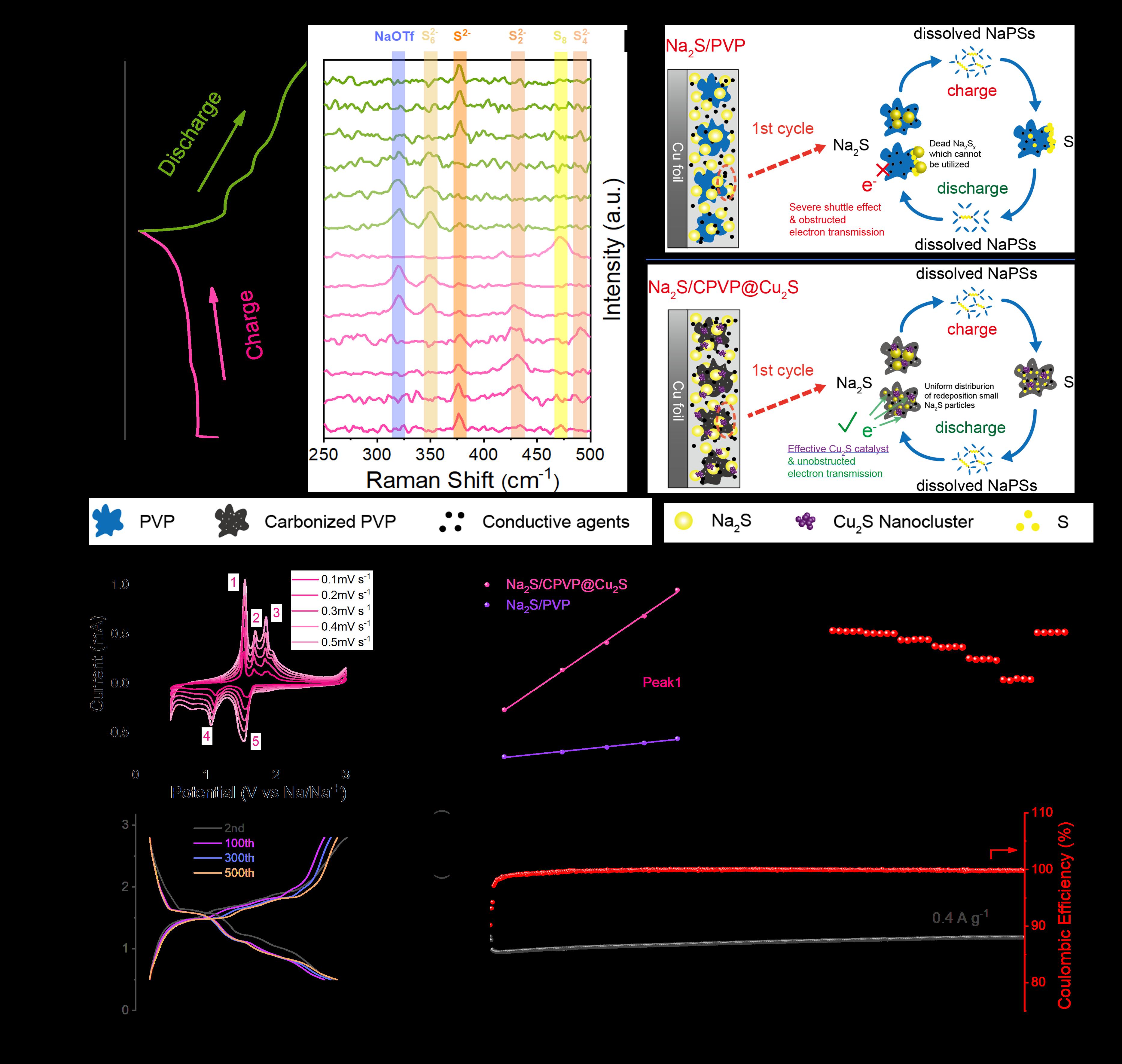 许晶晶研究员与中国科学院苏州纳米所吴晓东研究员合作:通过调节硫化钠的再沉积行为,巧妙地设计了一个有前途的Na2S/CPVP@Cu2S一体化阴极。热处理高温促进聚乙烯吡咯烷酮(PVP)碳化成包裹硫化钠颗粒的连续导电基体,铜集流体表面的氧化层与硫化钠发生原位反应,生成硫化亚铜催化剂。得益于一体化阴极的协同作用,微米级硫化钠颗粒在初始循环过程中通过固-液-固转化迅速自细化为纳米级硫化钠颗粒,且在后续循环过程中尺寸保持稳定。由于快速的转化动力学有效地抑制了穿梭效应,所制备的Na2S/CPVP@Cu2S表现出优异的循环稳定性和倍率性能。本工作实现了源自工业废弃物的硫化钠的稳定循环,为室温钠硫电池无钠阳极体系的研究和实际应用提供了重要参考。