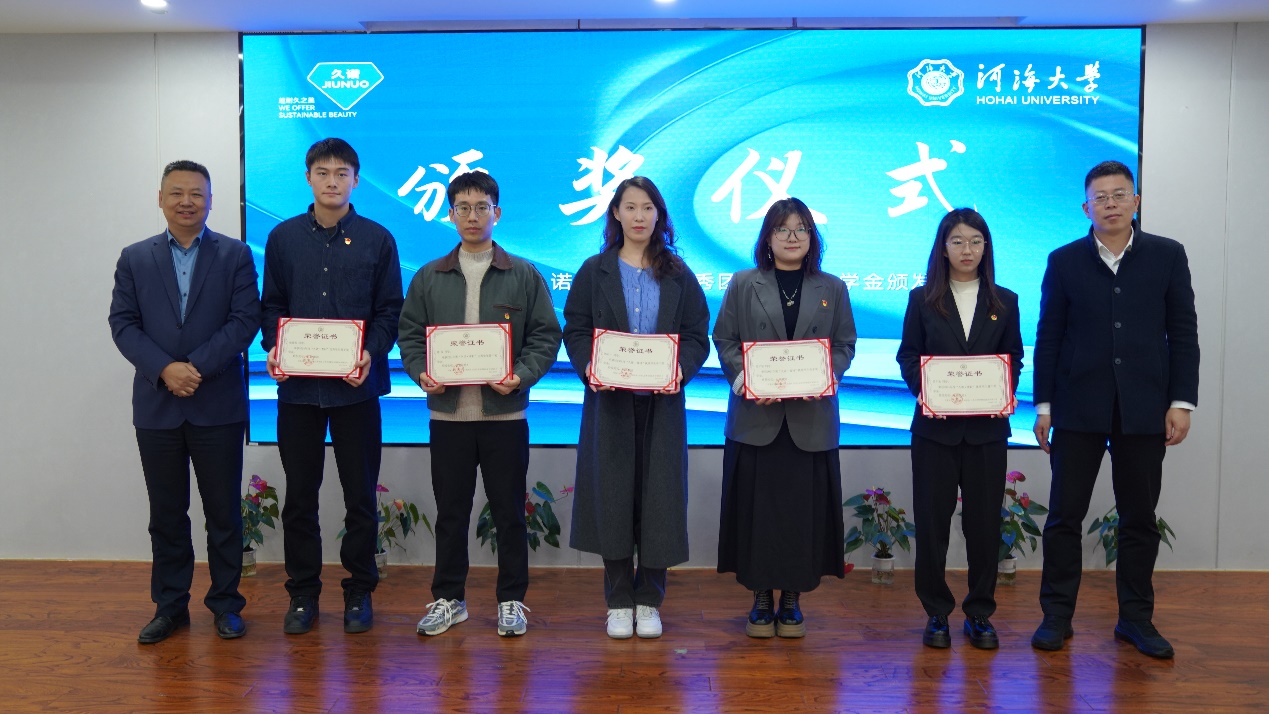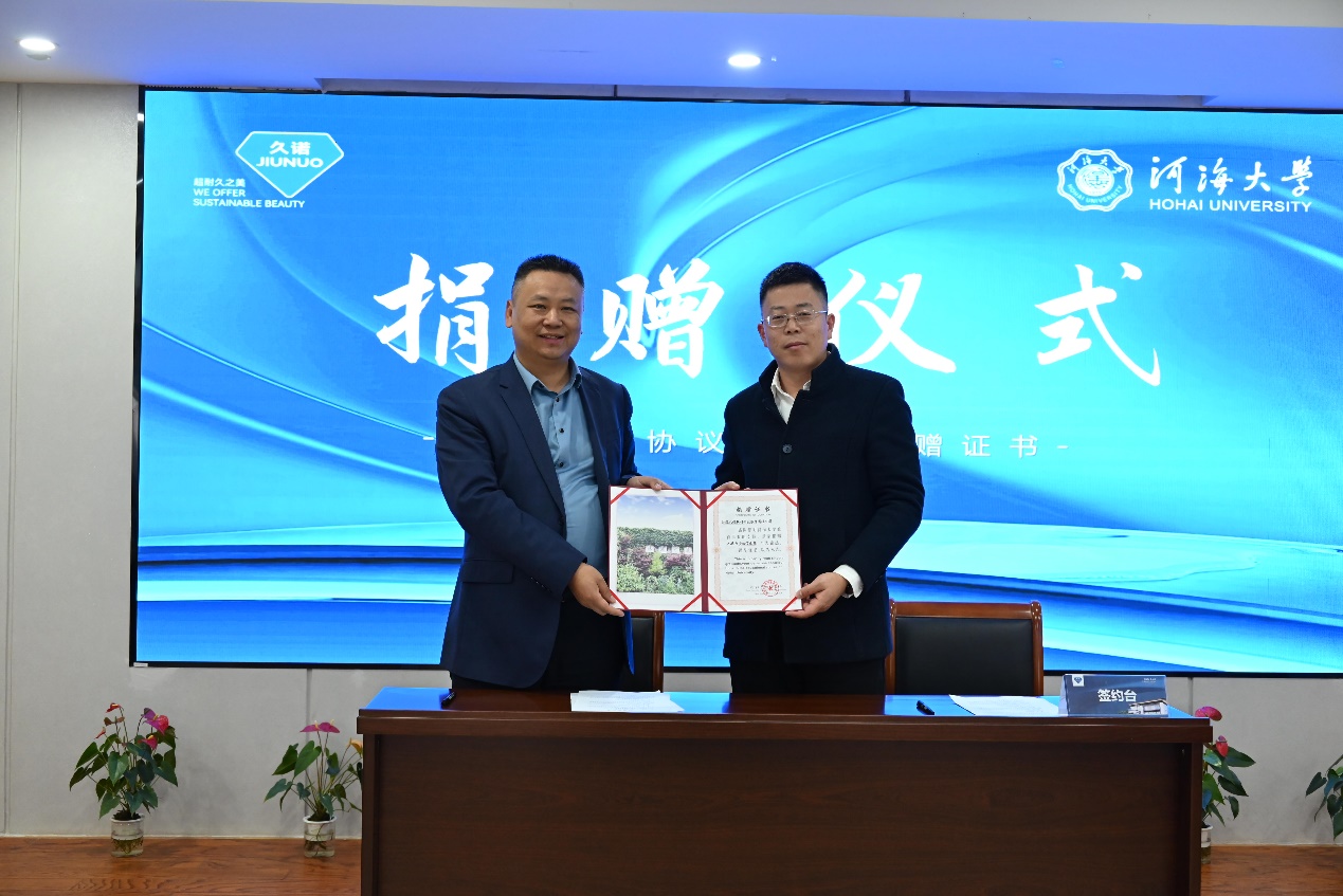江苏久诺新材科技股份有限公司董事长王志鹏、学院党委书记陈伟刚代表双方签署捐赠协议并共同为获得2024年度“久诺·菁材”优秀学生骨干奖学金的学生骨干颁发获奖证书,陈伟刚向久诺公司颁发捐赠证书。