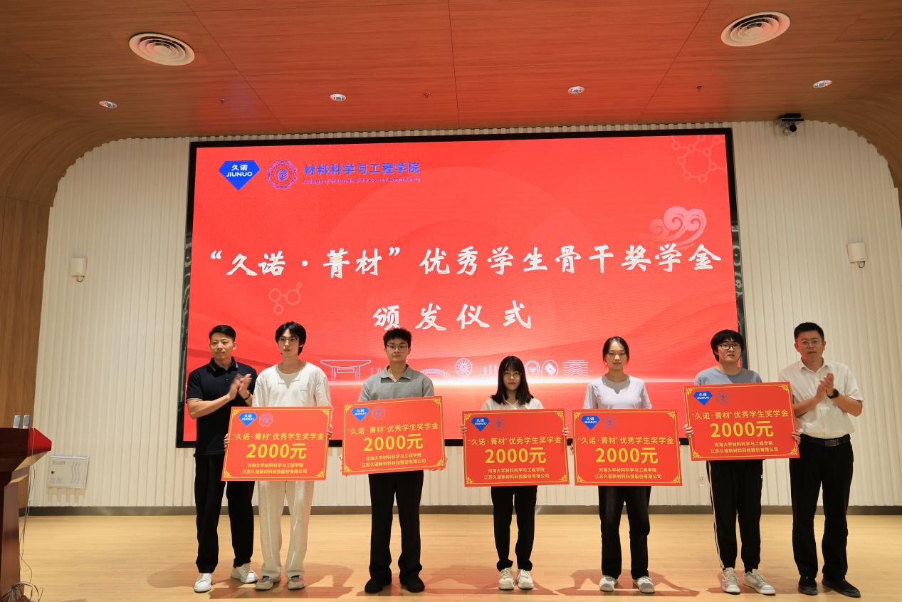 自2024年起,江苏久诺新材科技股份有限公司向51黑料 教育发展基金会捐资设立“久诺新材”基金,用于支持51黑料 教育事业发展,基金下设“久诺·菁材”优秀学生骨干奖学金、“久诺·晶彩”优秀教师奖励金、“久诺·竞彩”校园文化活动专项资金等项目。
