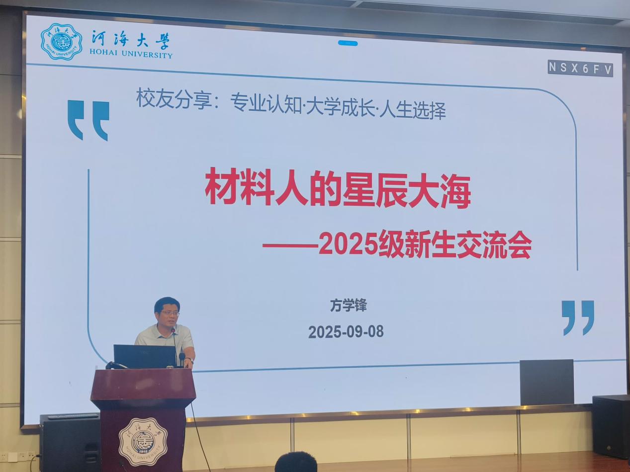 随后,江苏省“六大人才高峰”高层次人才培养对象、正高级工程师、南京市锅炉压力容器检验研究院副院长方学峰校友登台分享。他首先从宏观角度阐述了材料科学在现代工业体系中的核心地位与广泛应用,涵盖能源、交通、航空航天等多个国家战略领域。接着,他回顾了自己从河海求学到投身特种设备检验行业的奋斗历程,分享了参与20余项国家级、省部级科研项目的宝贵经验。最后,他结合自身成长,为新生提出三点学习建议:一是夯实专业基础,二是注重实践能力,三是保持终身学习。他勉励同学们:“材料是工业的基石,你们是未来的基石——唯有脚踏实地,方能顶天立地。”