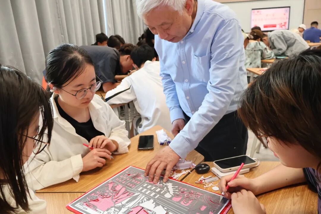 随后的实践教学中,同学们以小组为单位展开创作。经过近两小时的协作,在杨老师与何老师的指导下,大部分小组都完成了具有较高难度和创意的刻纸作品,不少作品在细节处理上得到了老师们的指导与肯定。